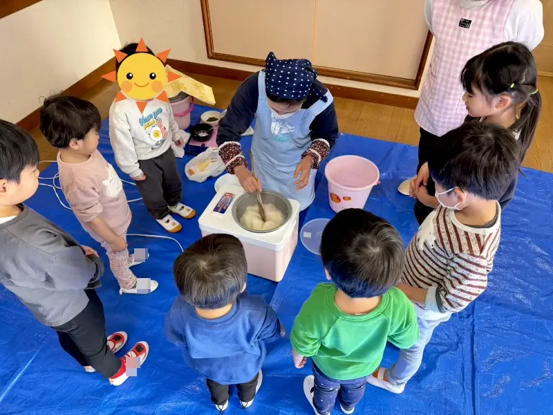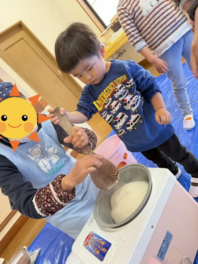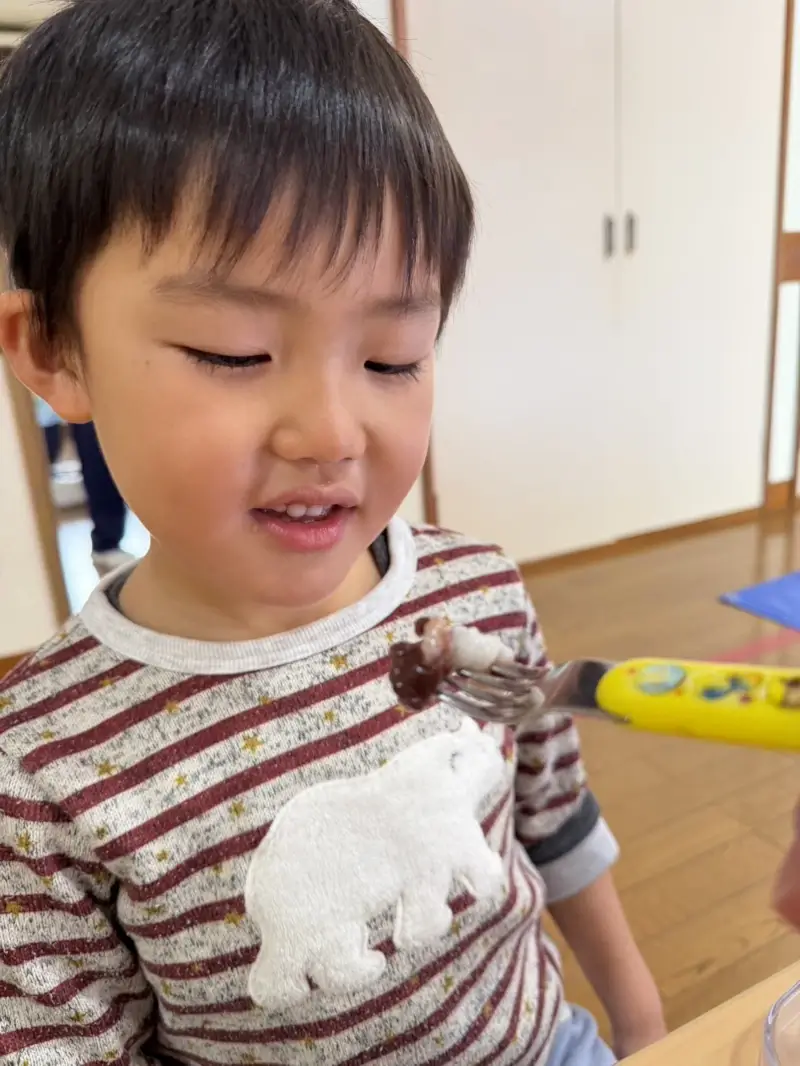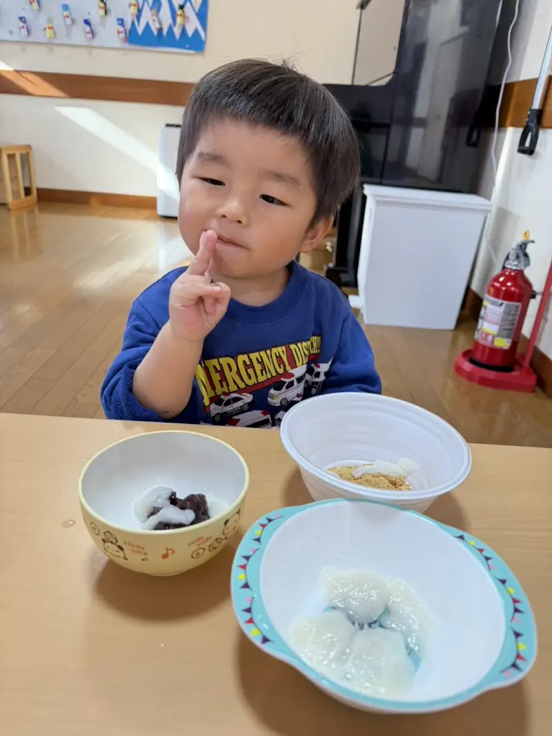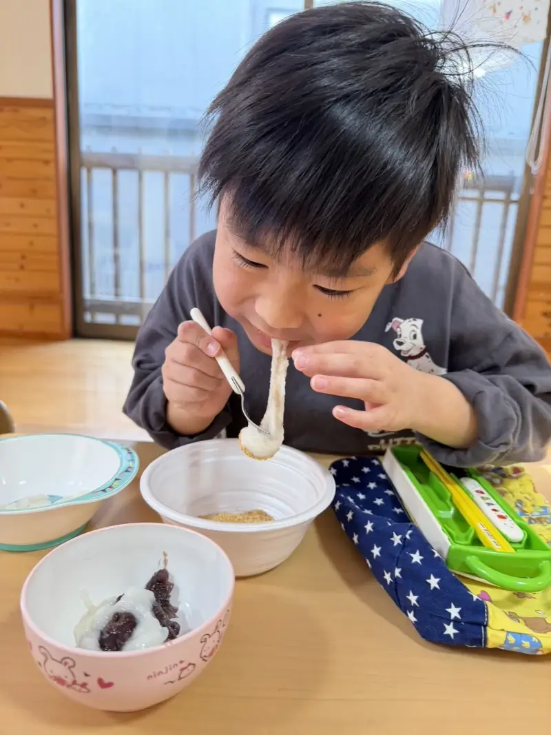 お餅に馴染みがない子もいて、最初は少し不安そうでした。でも、お友だちが楽しそうに食べている姿を見て、勇気を出してパクッと。『食べられた!』と嬉しそうにしていたのが印象的でした。