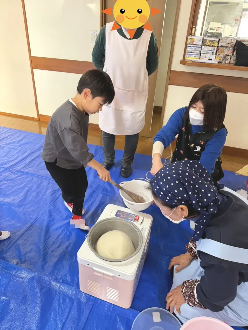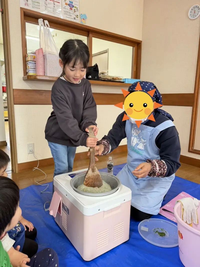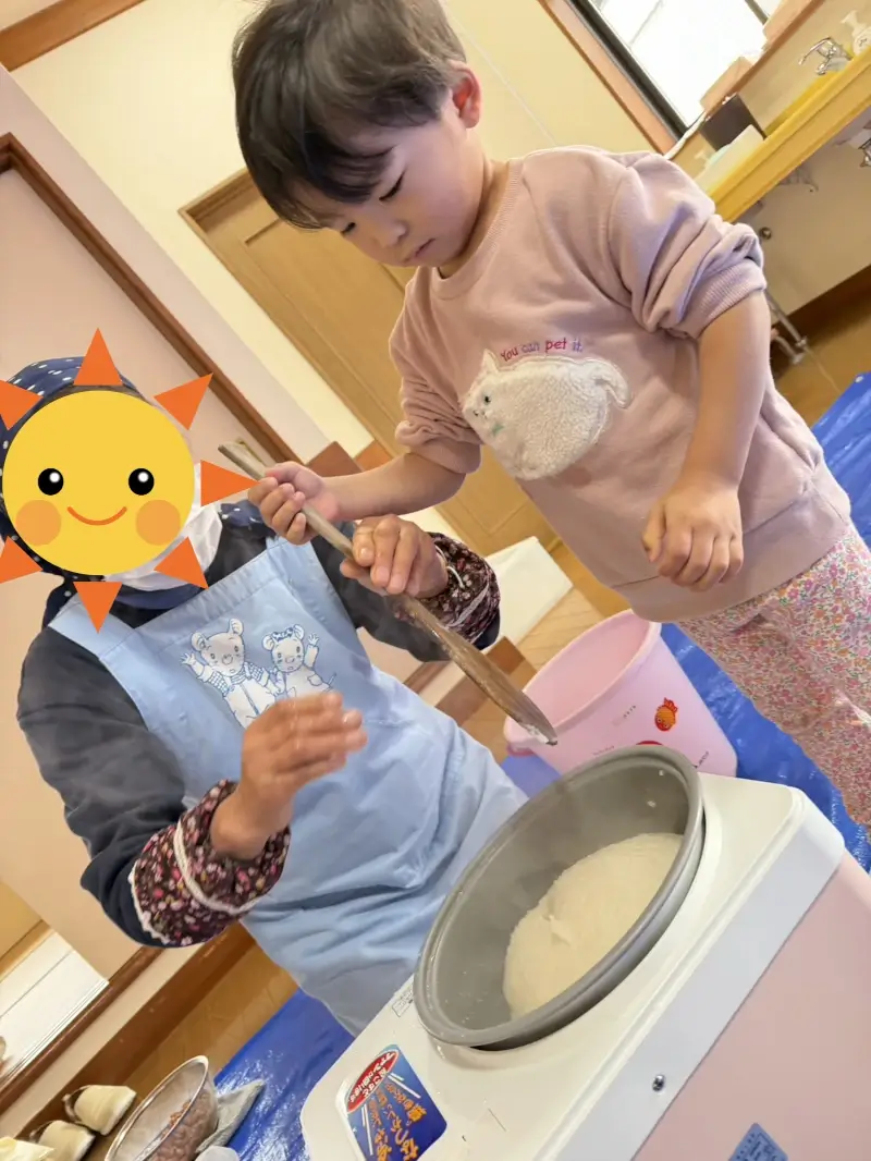 お餅を丸めるときの柔らかい感触に、子どもたちは大喜びでしたね。触覚刺激としてもとても良い経験になりました。