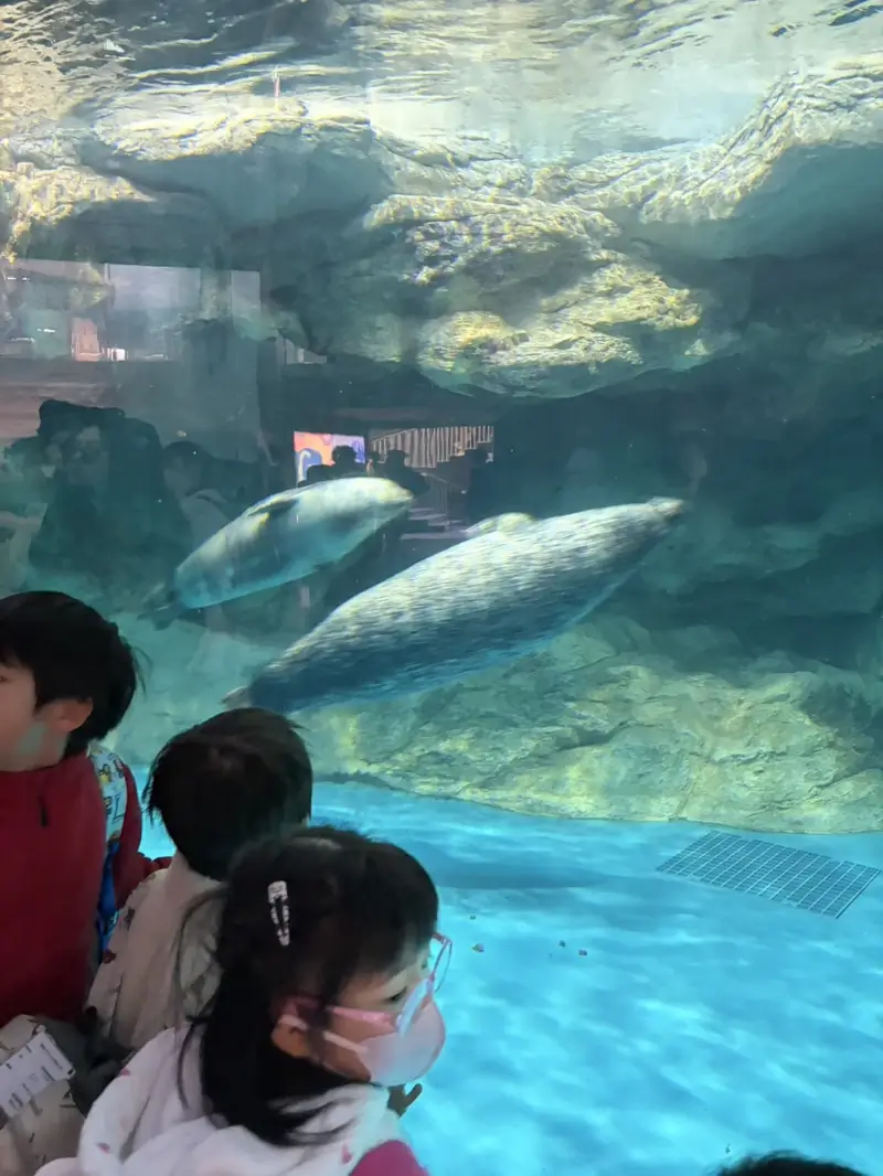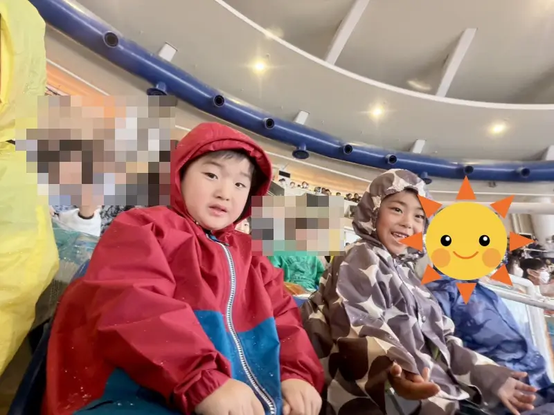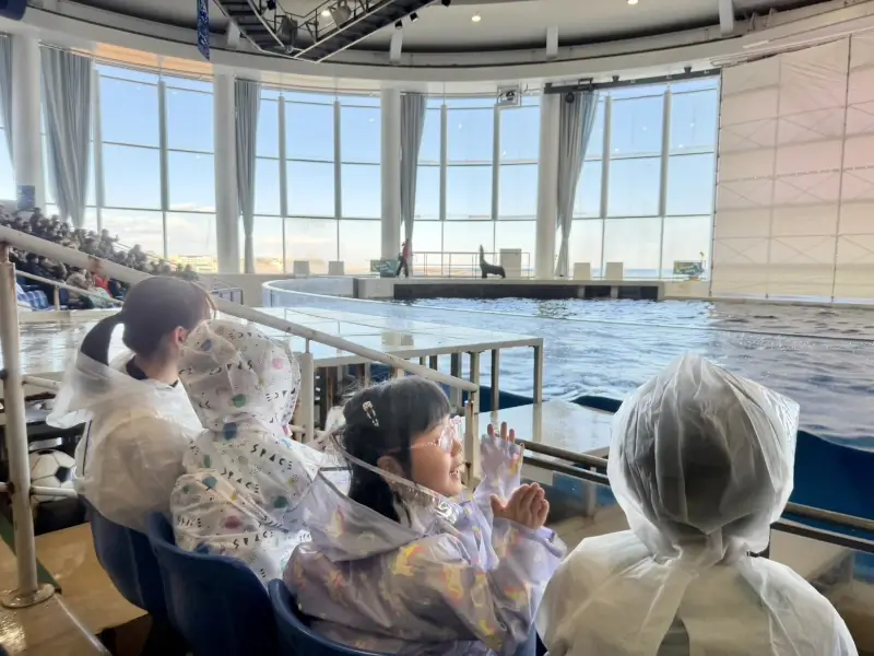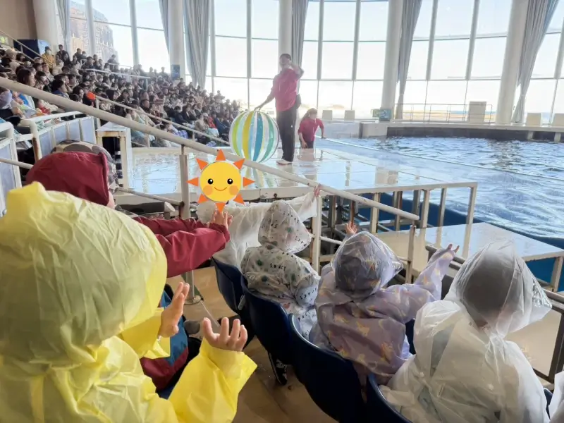 お弁当を食べた後は、イルカ・アシカのオーシャンライブショーを見学しました。プールの近くの席に座ったので、合羽を着ていても少し濡れてしまったけれど、それすら楽しんで笑っている子どもたちの姿がとても可愛かったです。ショーが始まるまで静かに座って待てたのも素晴らしかったですね。