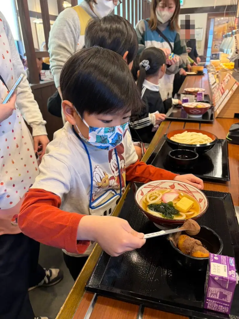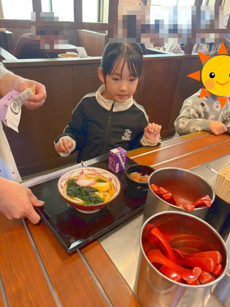 その後はお昼を食べに丸亀製麺へ。トレイを持って、自分で選んだうどんをこぼさないように運ぶ……。真剣な表情でうどんに向き合っている姿がとても素敵でした。