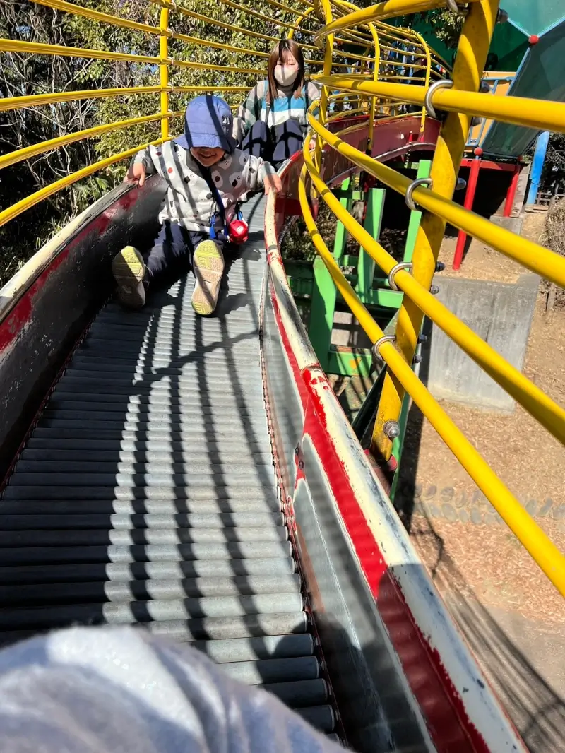 お腹いっぱいエネルギーをチャージした後は、いよいよ八幡山公園です!長いローラー滑り台を風を切って滑りました!